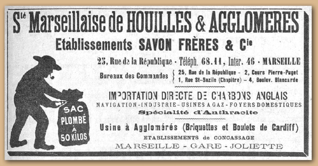 L’Indicateur marseillais 1922 publie une quinzaine de « réclames » concernant les importateurs- dépositaires des divers charbons principalement anglais : agglomérés, houille, coke, anthracite, lignite. A Marseille en 2023, il ne reste plus qu’un grossiste « combustibles » à Saint-Menet et son agence, drôle de hasard, siège au 56 bd Bompard !