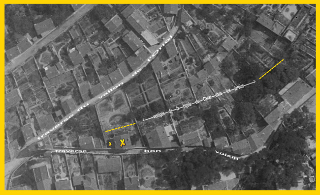 1° une maison de campagne en forme de chalet située au quartier du vallon de l’Oriol, banlieue de Marseille. 2°un terrain avec petite maison à simple rez-de-chaussée percée d’une porte et d’une fenêtre visant sur un chemin ; est comprise dans la présente vente, une langue de terrain qui se trouve en dehors du mur sud du dit terrain ou jardin, qui est traversée par une rigole souterraine du Canal, le tout d’une superficie d’environ 149m2 situé au même quartier de N D de la Garde, lieu dit Vallon de l’Oriol, banlieue de Marseille, confronté – au Nord traverse Bon voisin, au Sud traverse du vallon de l’Oriol –
