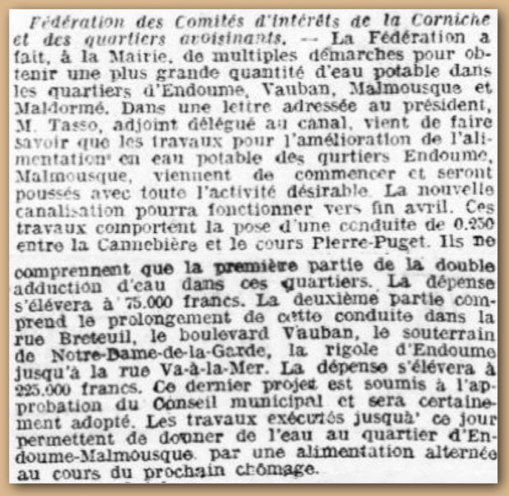 Dans la presse locale, arrivée de l’eau potable à Endoume :