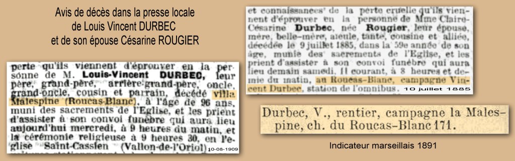 Il est curieux de constater que lors du décès de Césarine Durbec-Rougier en 1885, la propriété est appelée « campagne Vincent Durbec, station de l’omnibus » !