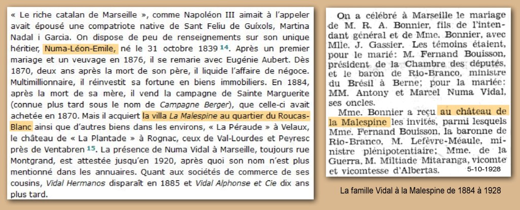La Malespine est achetée par Numa Léon Emile Vidal en 1884. En 1928, un article de journal révèle que la famille Vidal est toujours propriétaire à la Malespine.