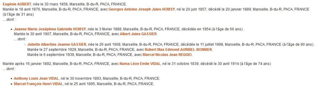 La généalogie permet de comprendre les liens de famille (Bonnier, Gassier, Vidal) :