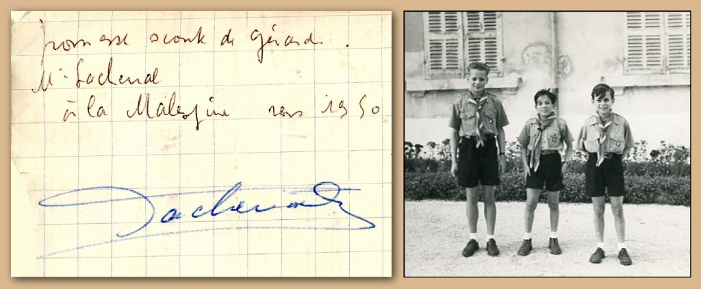 Louis Lachenal, le célèbre alpiniste ancien Scout, a assisté à des promesses à La Malespine en 1950 ! Malheureusement, il n’est pas sur la photo, mais a laissé sa signature.