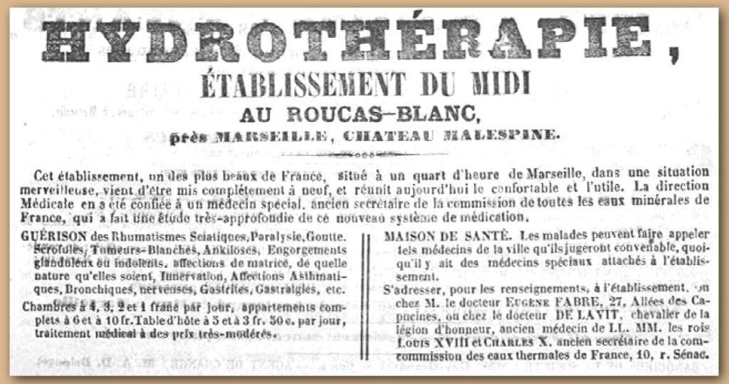 Au commencement du XIXe siècle, un négociant draguignanais nommé Malespine avait dépensé cent mille francs pour créer face à la mer, « une riante oasis au milieu d’une solitude aride« . En 1822, Étienne Guiaud, médecin, achète la propriété aux enchères pour la somme de 23000 francs pour y installer un asile d’aliénés. A sa mort en 1825, son fils Jacques, médecin chef de l’Asile d’Aliénés, quartier St Pierre, lui succède.