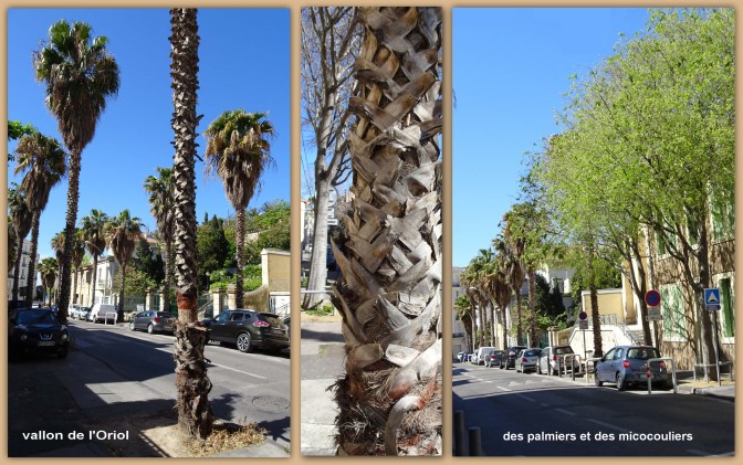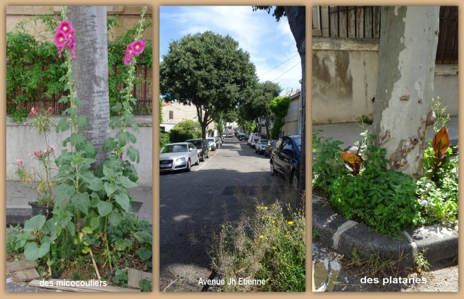 Sur la colline, seules quelques voies ayant une largeur suffisante ont pu être ombragées avec platanes ou micocouliers. : av. de la Corderie, av. de la Corse, av. Ch. Livon, av. Pasteur, av. Jh. Etienne, place du Terrail. Sur la place du Quatre-Septembre , de jeunes tilleuls avoisinent avec d’immenses micocouliers !