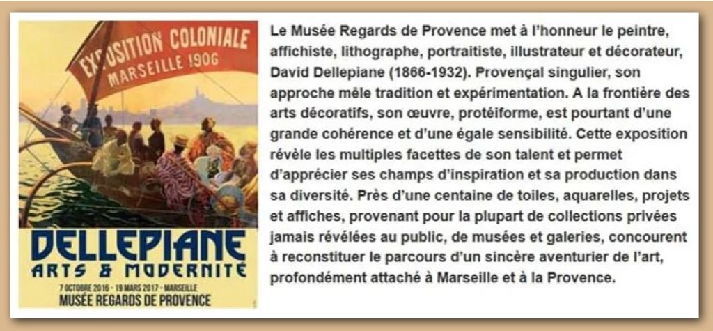David Dellepiane devient élève de l’école des Beaux-Arts de Marseille. Les affiches qu’il compose pour le 26e centenaire de la Fondation de Marseille (1899) et l’Exposition Coloniale (1906) le font connaître.