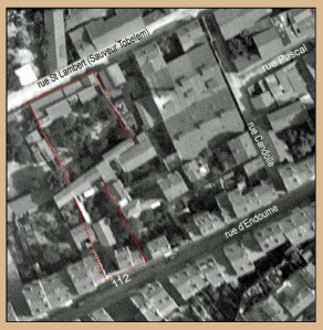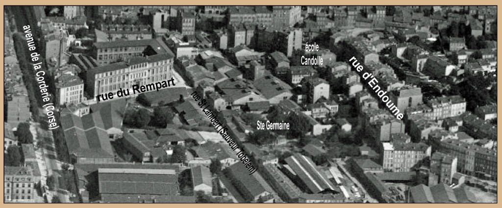Une plaque discrète -aujourd’hui disparue- indiquait sur l’entrée du 112 rue d’Endoume « Maison Ste Germaine« . Une vue aérienne prise en 1930 permet de situer cette propriété entre rue d’Endoume et rue Saint-Lambert (rue Sauveur Tobelem).