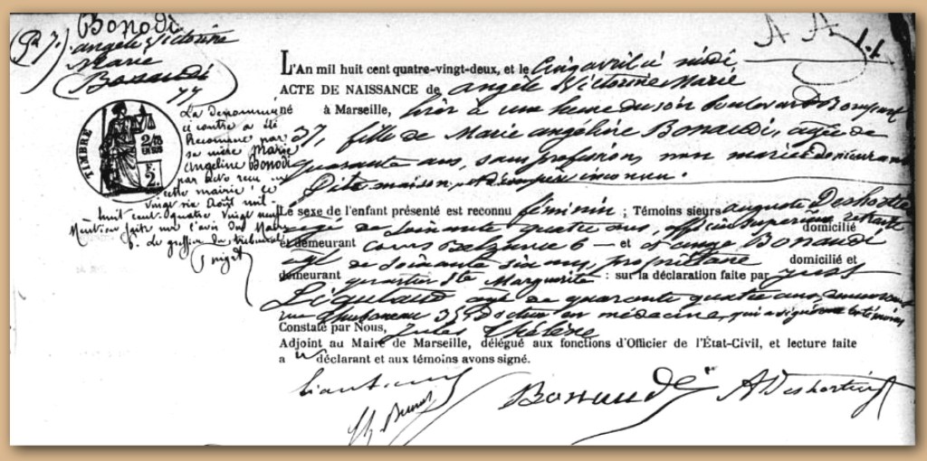 Auguste Deshorties, officier supérieur, est témoin sur l’acte de naissance d’Angèle Bonaudi; il demeure alors cours Belsunce 6.