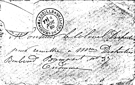 La lettre ci-dessous a été conservée par Marie Bonaudi qui habitait le 37 Bd Bompard ainsi que (parfois) le colonel Deshorties : en 1880 (tampon de la lettre ci-dessous) et en 1888 où son nom apparait dans l’Indicateur marseillais à cette même adresse.