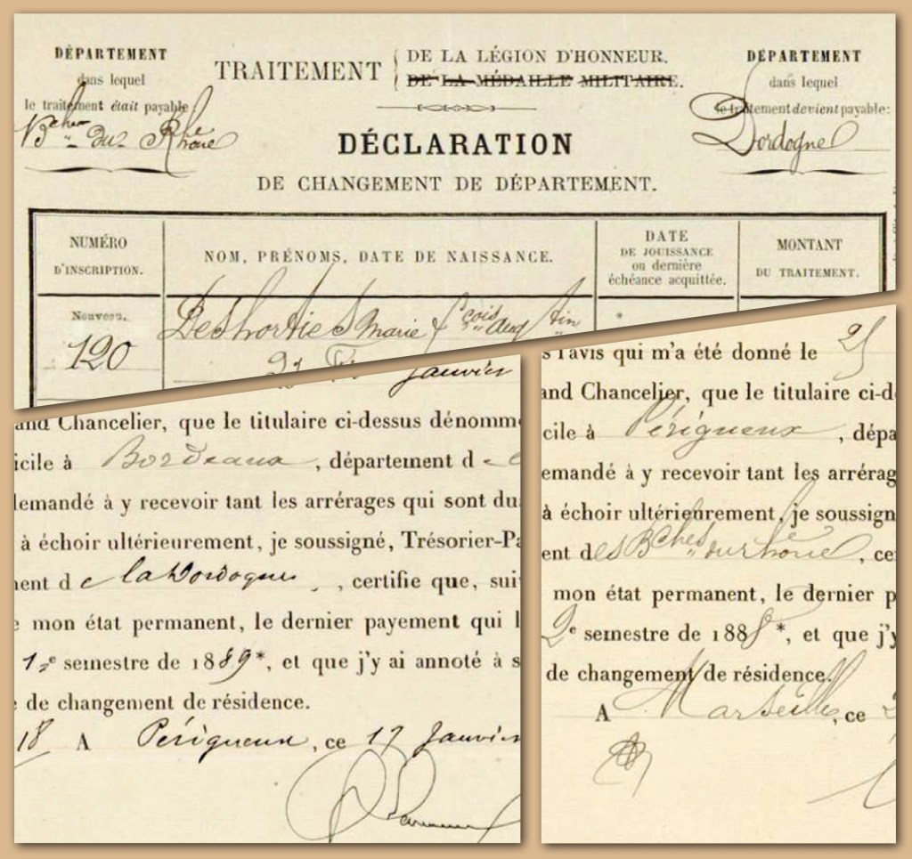 Son dossier de traitement de la Légion d’Honneur contient ses demandes de changements de départements, changements dépendant de ses activités militaires (et familiales ?) : Périgueux/Marseille entre 1888 et 1890, et Périgueux/ Bordeaux en 1889.