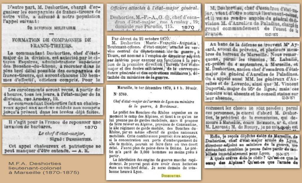 Marie François Auguste Deshorties a eu quatre enfants à Périgueux (Dordogne) entre 1851 et 1861 avec son épouse Nelly Pontard, mais sa vie de militaire l’envoie à Marseille dès 1868.