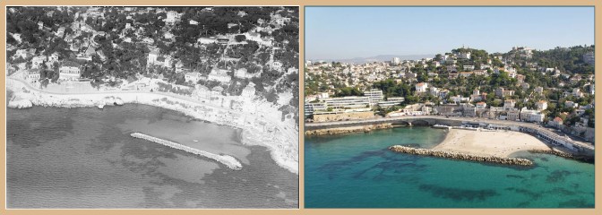 Ci-dessous, les deux vues aériennes de la plage du Prophète (I.G.N. 1922 et 2023) montrent comment la jetée non entretenue (et devenue digue) a engendré l’ensablement progressif de l’anse, transformant le petit port-abri en une belle plage de sable.