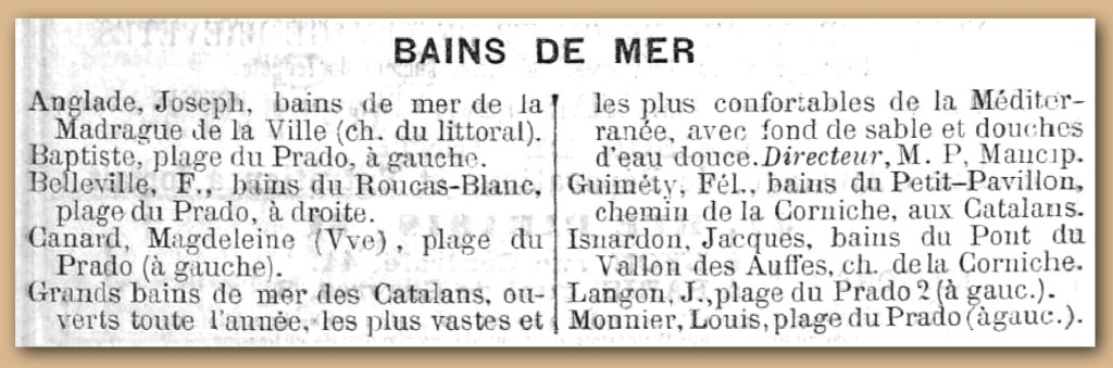 L’ouverture de la Corniche à la circulation en 1863 a favorisé l’ouverture des établissements « bains de mer » . En 1885 l’Indicateur marseillais en indique 9 dont 3 sur le secteur Catalans-Endoume.