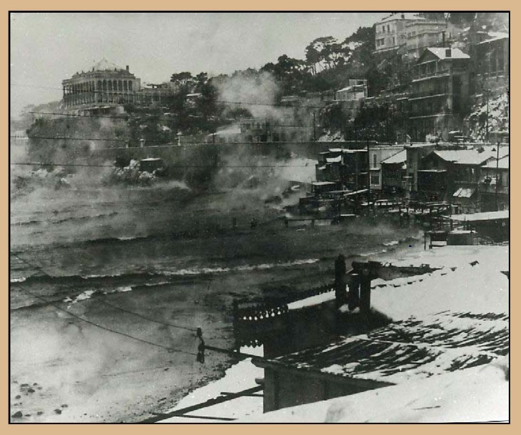 La carte postale ci-dessous prouve l’existence de ces « bains » (avec cabines) créés en 1880 … étonnant car le petit espace de sable compris entre les cabanons et la mer ne laissait pas beaucoup de place aux baigneurs :