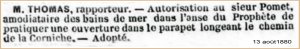 On y apprend qu’en 1880 Pomet a obtenu la concession d’un « bain de mer » à la calanque du Prophète pour 5 ans; suite à sa demande, il est autorisé à pratiquer un ouverture sur le parapet, chemin de la Corniche.