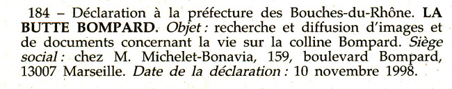 Depuis, l’expression « La Butte Bompard » apparait sur le Net comme s’il s’agissait d’une réalité géographique, sans que les utilisateurs (sites de balades marseillaises, commerces…) aient pris conscience que ce nom ne se trouve sur aucune carte de Marseille; c’est le nom de notre association, uniquement !