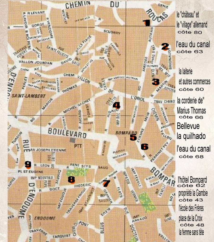 A l’initiative du Comité du Vieux-Marseille une première balade commentée a eu lieu dans le quartier; elle fut suivie par d’autres : avec le C.I.Q. Bompard, avec l’association B.O.R., avec le C.I.Q. st Eugène (vestiges du terroir marseillais) et dans le cadre des Journées du Patrimoine (dans les pas de Dominique Piazza), avec le Club M.G.E.N. (circuit ci-contre).