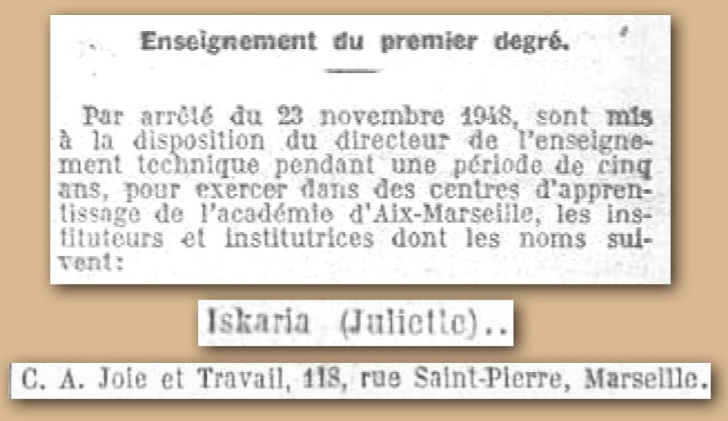 Juliette Iskaria. En 1989 j’ai rencontré Mme Maurice Racol (née Juliette Iskaria) qui, suite à mon appel dans le Bulletin du Comité du Vieux-Marseille pour retrouver témoignages et documents sur le quartier, me téléphone. Je la rencontre chez elle au Roucas-Blanc , traverse de la Serre, ainsi que sa sœur Madeleine.