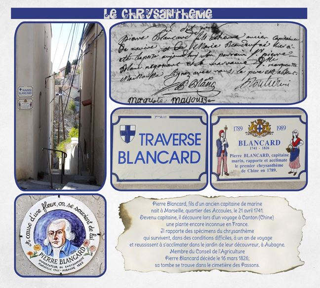 Pierre Blancard est né à Marseille, quartier des Accoules d’un père ancien capitaine de marine. On ne sait rien de sa vie jusqu’à ce voyage à Canton où il découvre une plante inconnue en France. Il en subtilise 3 boutures, dont une seule, cultivar pourpre de Ku-hoa, survit au voyage (qui dure un an) et fleurit l’année suivante en Provence ainsi qu’au Jardin des plantes à Paris, où elle avait été envoyée. Quelques plantes expédiées en Angleterre y fleurissent aussi en 1791.