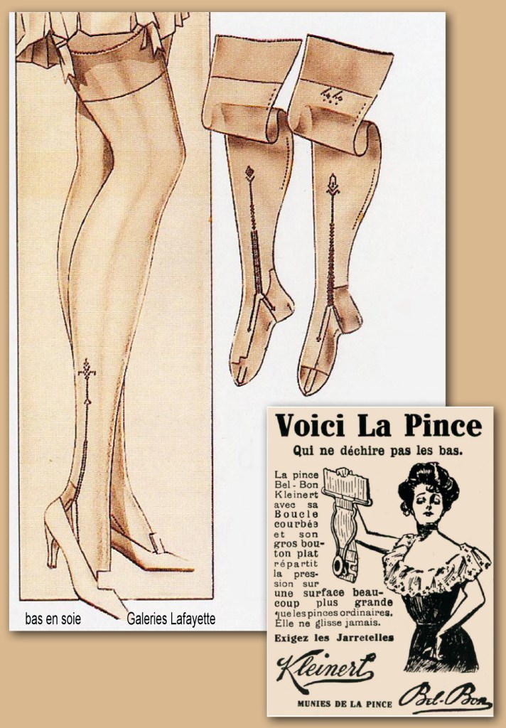 Devenue plus libre, pratiquant le sport et la danse, la femme adopte des tenues plus pratiques, négligeant la taille et la poitrine, raccourcit la jupe, supprime le corset au profit du porte-jarretelles. Les bas sont en soie, avec une couture (inévitable avec les machines à tisser avant la Seconde guerre mondiale).