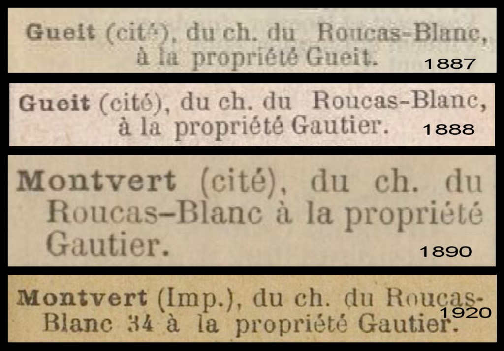 Entre 1888 et 1890, la « cité Gueit » devient « cité Montvert »; le changement de nom a pu être demandé par le nouveau propriétaire, puis en 1920, « impasse Montvert ». Albert Gautier a probablement choisi ce nom qui symbolisait la fierté qu’il éprouvait pour le parc d’agrément qu’il avait créé.