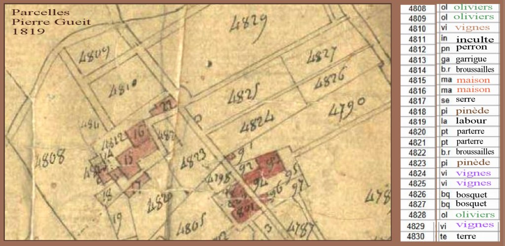 Sur le cadastre de 1794-1795, cette parcelle (hors de la porte St-Victor, section 20) était ainsi décrite : « Bon terrain en vignes, bled, oliviers et arbres fruitiers; un grand bâtiment de maitre à cinq croisées, une terrasse et un petit parterre ». En 1827, la propriété s’étendait sur 12750 m2.