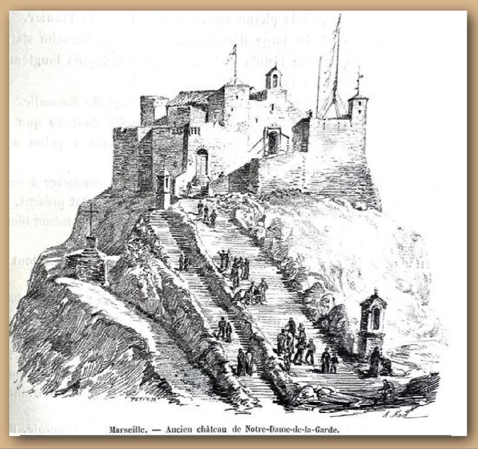 Le nom de gàrdi est employé pour la première fois dans une charte datée de 904. En provençal, la gàrdi est un lieu élevé d’où l’on peut observer; une colline qui domine un pays. Dès les premiers siècles de notre ère, les signaux d’une vigie s’allumaient au sommet de cette colline marseillaise où furent construits par la suite une tour, une petite chapelle qui prit le nom de Nostra Dona de la Gàrdia et un fort.
