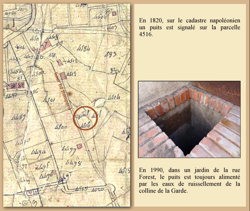 Rue Michel Gachet : découverte d’un puits rempli d’eau lors de la construction d’un immeuble, à l’emplacement même où jadis œuvraient des blanchisseuses. Le linge séchait alors sur la colline jusqu’au bd Marius Thomas.