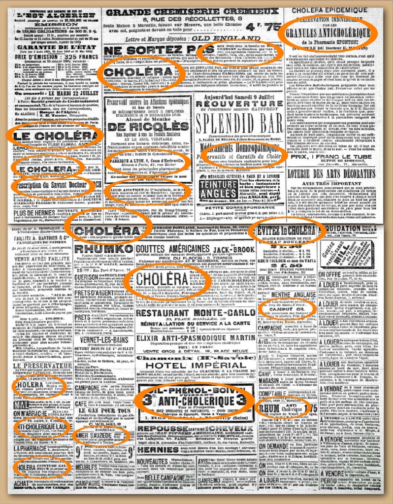 Le Petit Marseillais du 19 juillet 1884 présente près d’une vingtaine de publicités pour des produits estampillés « anti-cholériques » (qui correspondent à la théorie « miasmatique » dominante dans la ville): des alcools de menthe, liqueurs et élixirs,… du cognac ou du rhum … des huiles… des pilules, bonbons, capsules ou granules homéopathiques… des ceintures (américaine ou galvanique)…