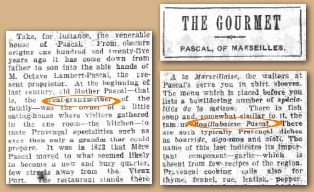 Un article paru dans « The Paris Times », magazine anglais, le 13 janvier 1929, s’intitulait « The Gourmet » et était sous-titré « Pascal, of Marseille ». Suivait un long historique du restaurant Pascal, rue Thiars, dont la renommée avait dépassé les frontières.