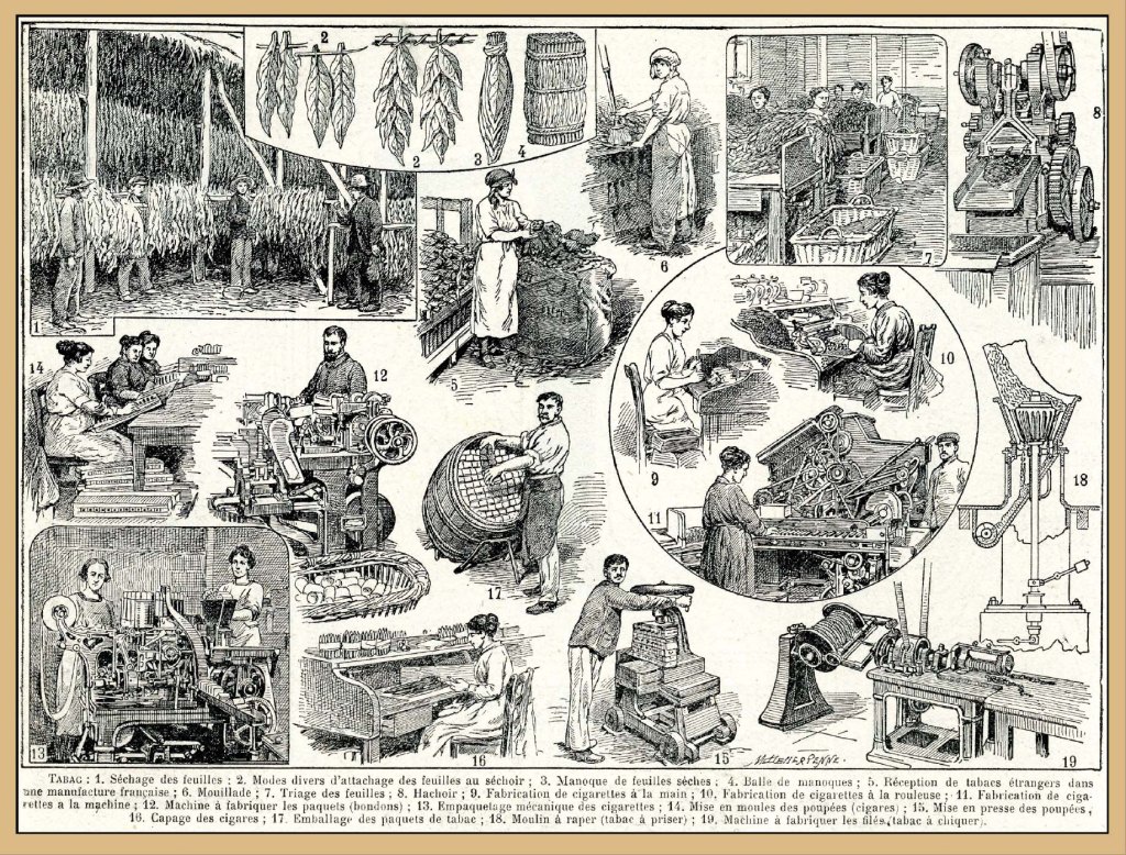 Dans le Larousse Universel 1934, une planche montre toutes les étapes du traitement du tabac dans une manufacture :