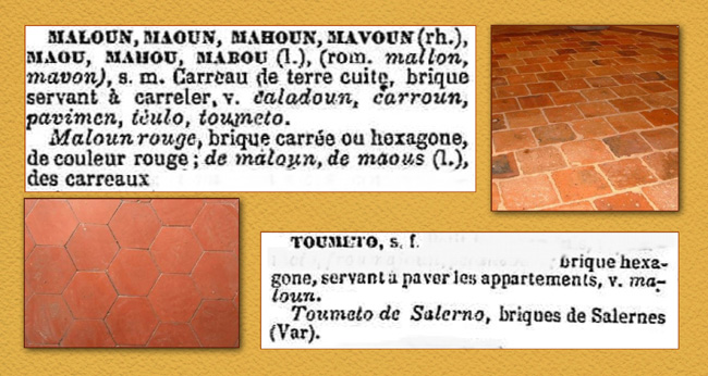 Dans le Midi, depuis le XVIe siècle les sols des maisons étaient recouverts de carreaux en terre cuite qui, suivant les qualités de l’argile, avaient des formes différentes : les carrés (les plus répandus), les triangulaires, les hexagonaux (les plus courants appelés « malons » ou tomettes) et les octogonaux (à cabochons). Ce revêtement, spécialité de l’industrie provençale était privilégié pour son entretien facile et la fraicheur qu’il procurait à l’habitation.