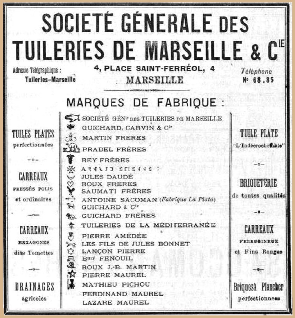 En 1922, sont répertoriées dans l’Indicateur marseillais 22 tuileries qui fabriquent des tuiles, mais aussi divers carreaux; des classiques : des pressés polis, des hexagones dits tomettes, mais aussi ceux dits « ferrugineux » et « fins rouges » !