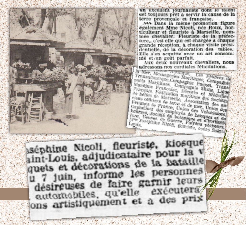 De nombreux articles de journaux la citent : en 1914, horticultrice et fleuriste, elle est adjudicataire pour la vente des bouquets destinés à la bataille de fleurs; en 1920, pour ceux ceux jetés à la mer lors de la cérémonie des disparus en mer; en 1928 le Père Noël de passage sur le Cours St-Louis la salue; en 1930, la presse locale la félicite pour sa médaille du Mérite agricole et en 1934 annonce la naissance de sa petite fille.