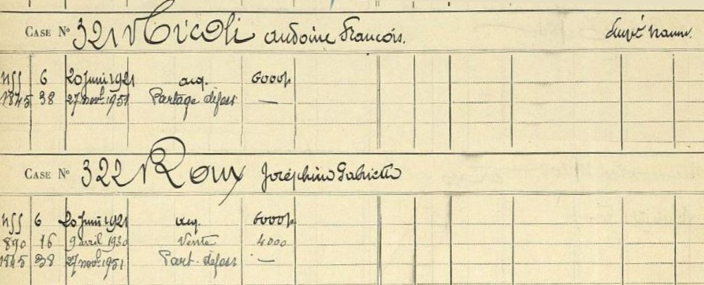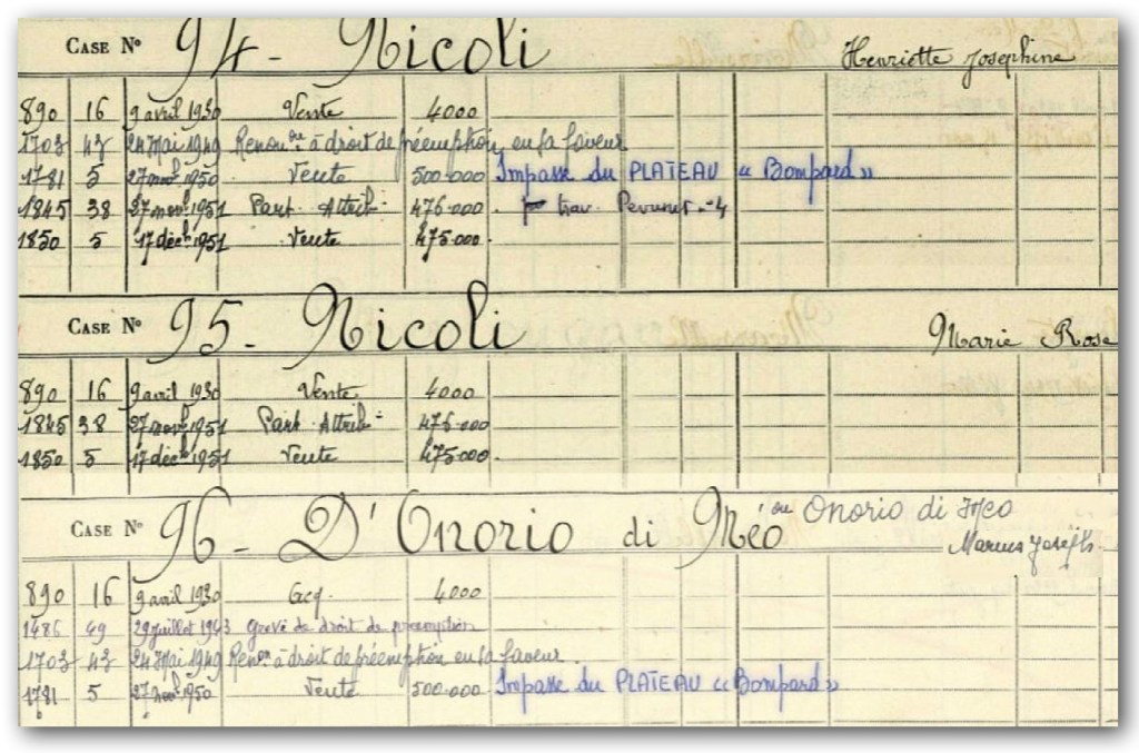 Antoine Nicoli décède le 2 février 1927 et son épouse Joséphine-Henriette en 1950. Le répertoire des formalités hypothécaires indique les dates de leurs acquisitions et de leurs ventes, biens dont ont hérité leurs filles, Marie-Rose et Henriette-Joséphine , et l’époux de cette dernière, Marius Joseph Onorio di Meo .