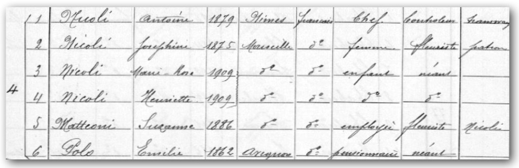 Le recensement montre que la famille Nicoli habite au N° 4 de la rue Perrinet-Pey en 1911 : Antoine contrôleur à la Cie Générale des Tramways », Joséphine ainsi que leurs deux filles, une employée et un pensionnaire.