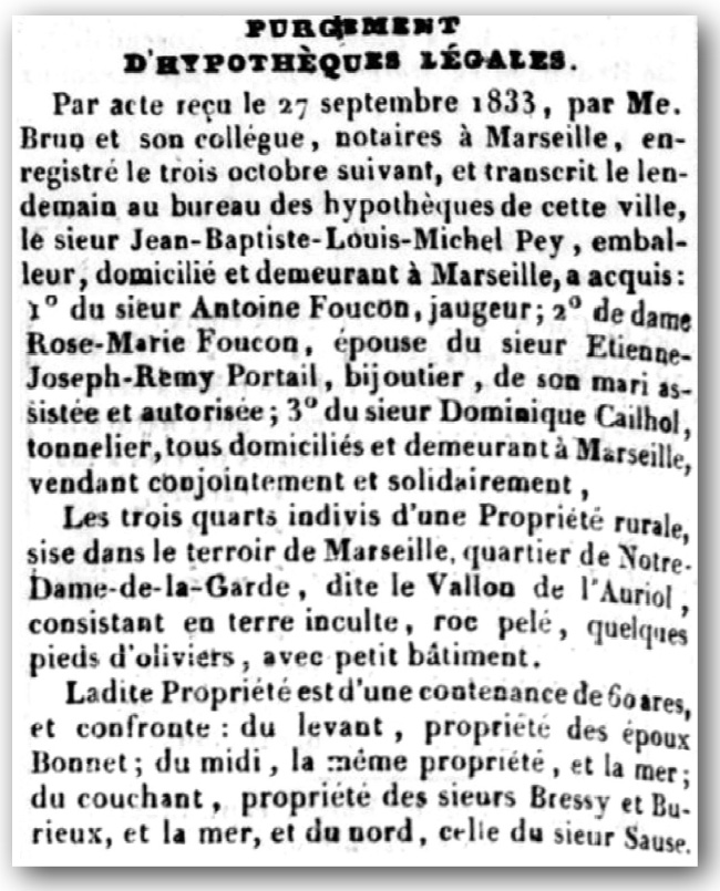 J.B. PEY, emballeur, achète les trois quarts d’une propriété rurale, terroir de Marseille, quartier Notre-Dame-de-la-Garde le 27 septembre 1833.