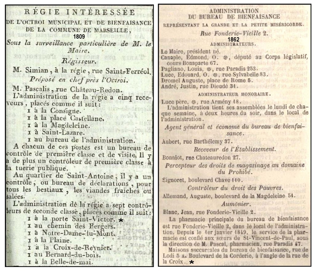 En 1809, un poste de contrôle d’une « régie intéressée de l’octroi municipal et de bienfaisance » est situé « à la porte Saint-Victor »; en 1862, « l‘administration du Bureau de Bienfaisance » a une succursale : la pharmacie sise à l’angle de la rue de la Croix et du bd de la Corderie (N° 42 en 1865 = N° 12 en 1870).