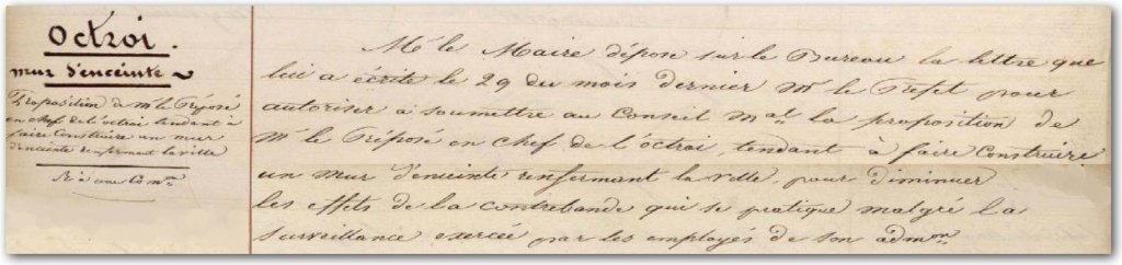 La destruction des remparts dès 1830 avaient favorisé la contrebande. Le compte-rendu du Conseil municipal du 5 septembre 1836 mentionne une demande du Préfet pour la « construction d’un mur d’enceinte renfermant la ville pour diminuer les effets de la contrebande«