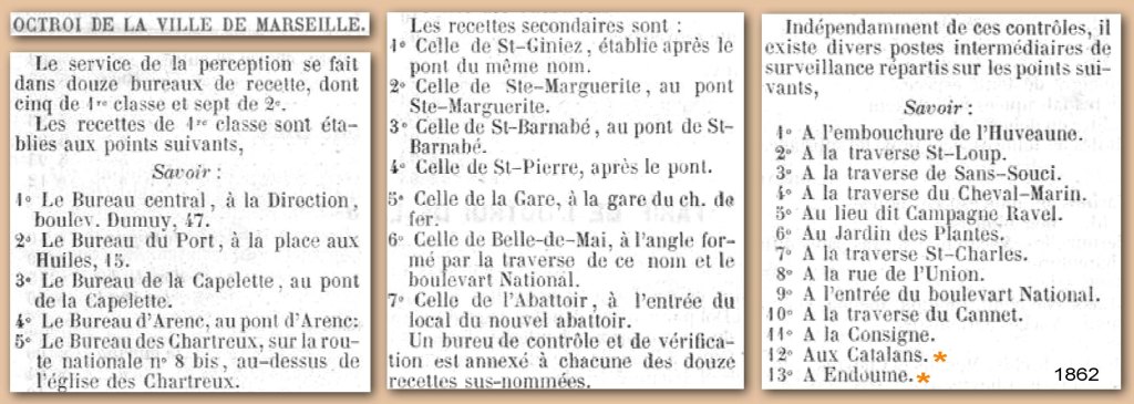 L’Octroi, péage qui avait été supprimé par l’Assemblée Constituante en 1791, fut créé à Marseille en 1800 par le préfet Delacroix. L’octroi percevait des recettes au bénéfice de la Ville sur les consommations locales introduites dans une zone délimitée.