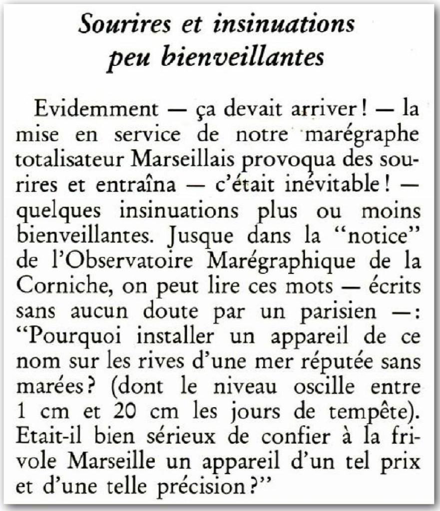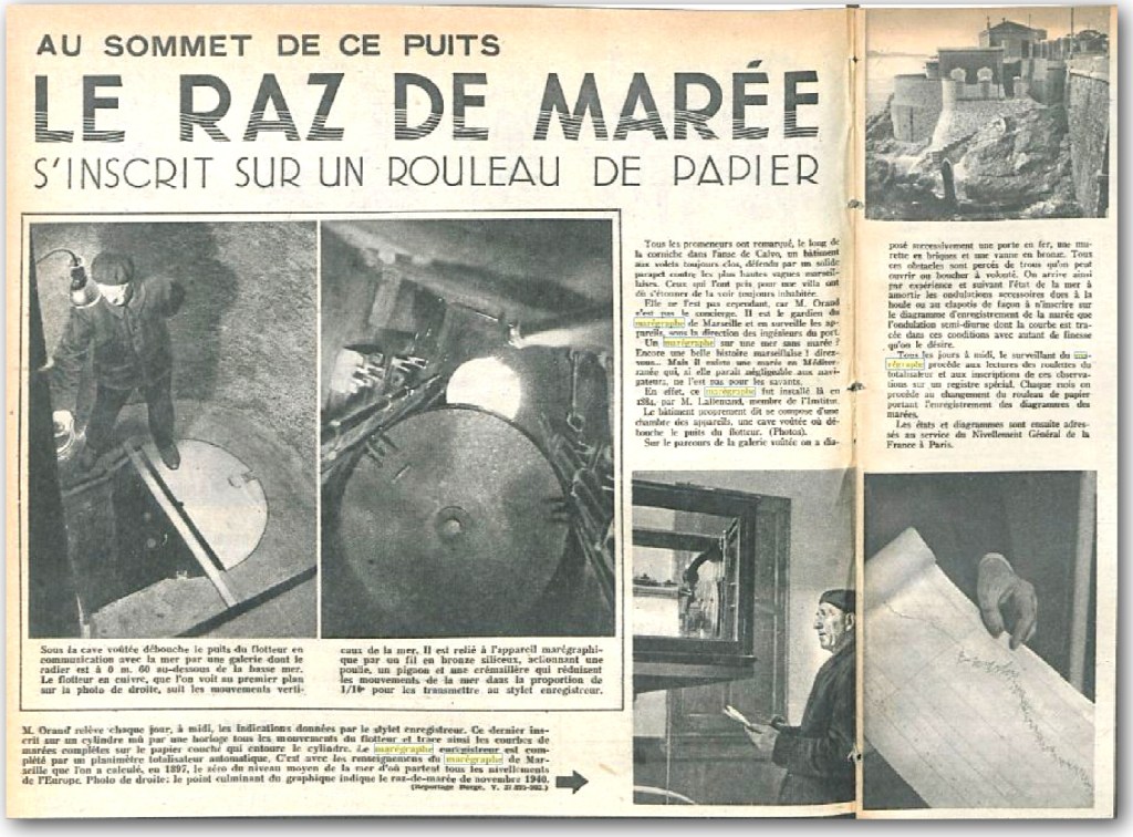 Raz-de-marée et tsunami à Marseille. Bien que le marégraphe ne soit pas conçu pour rendre compte d’un tel phénomène, un article de presse paru en 1942 titra le contraire à propos d’un raz-de-marée qui vida le Vieux-Port le 15 juin 1940 :